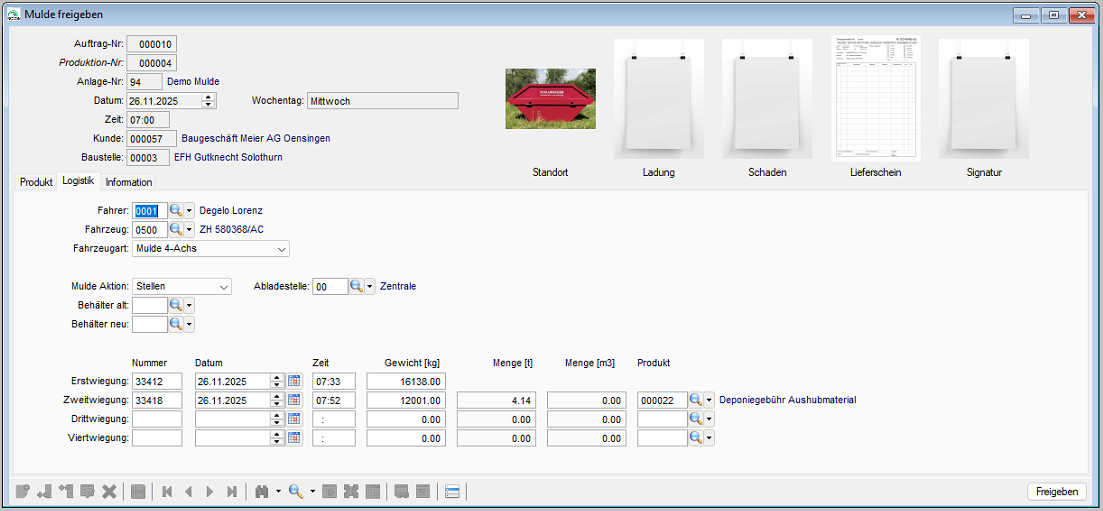 Nach Abschluss der Produktion Mulde stehen die Daten bereit für eine Freigabe. Vorher können Änderungen oder Ergänzungen vorgenommen werden.