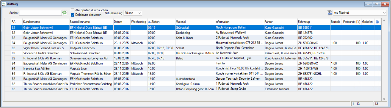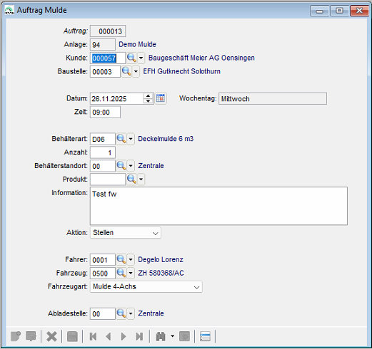 Hier das Beispiel eines Auftrages für den Muldenbetrieb.